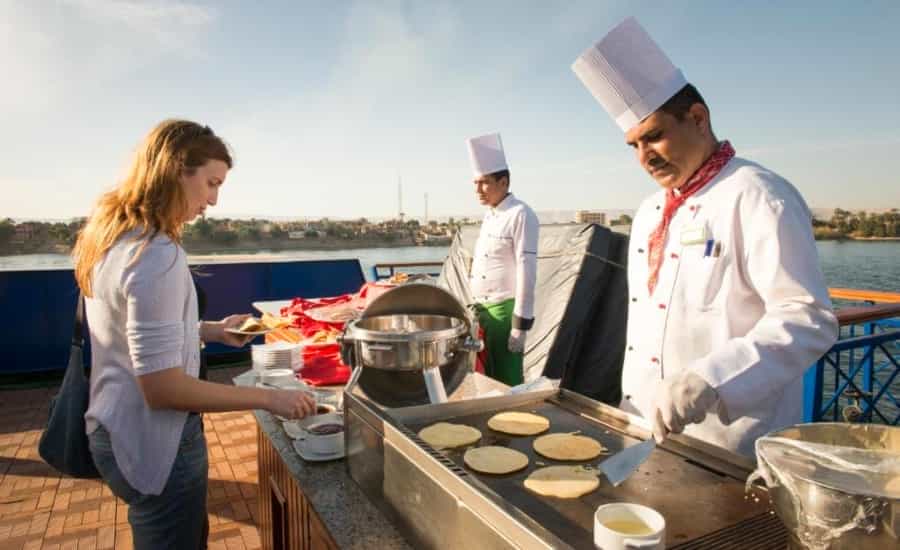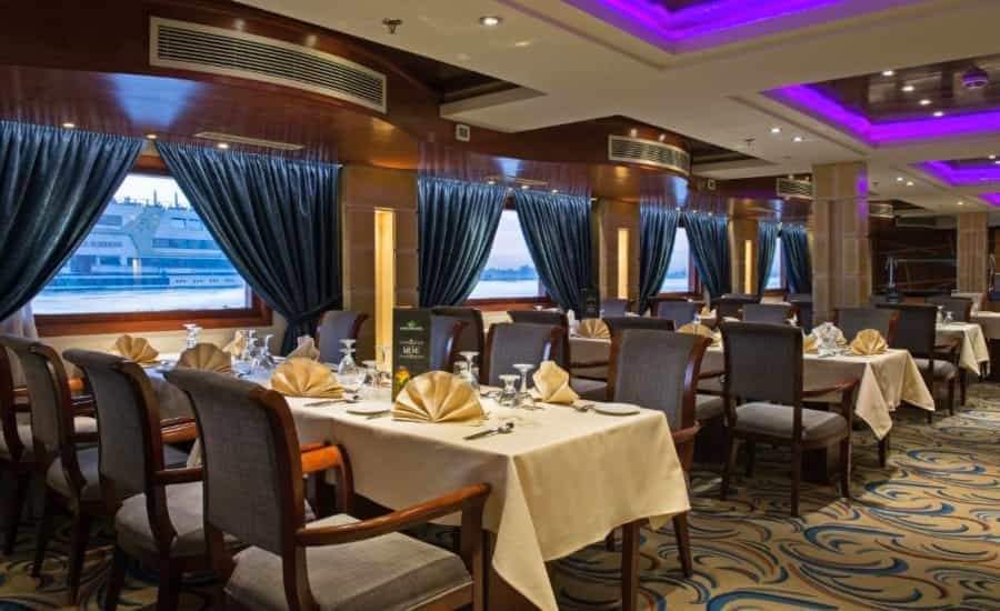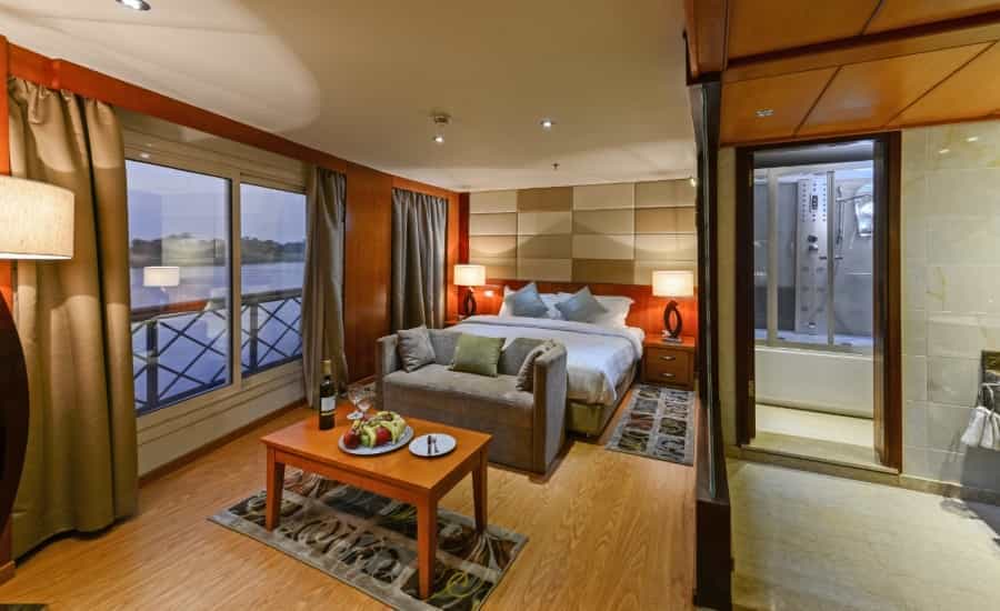 Aboard the Esmeralda, the journey through the Nile combines luxury, comfort, and the mystique of ancient Egypt. The ship’s stylish and spacious suites offer a modern yet timeless atmosphere, perfect for unwinding after a day of adventure. With a dedicated and welcoming crew, every detail is taken care of, from the exquisite meals in the elegant dining room to the refreshing swim on the sundeck, complete with a swimming pool and lounge area. The Esmeralda promises not only relaxation but also opportunities to enjoy evening entertainment, traditional music, and more, making the cruise an experience in itself.