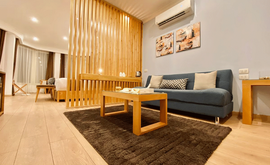 ♦ Features 100 standalone rooms furnished in modern décor with brightly patterned fabrics and wooden furniture