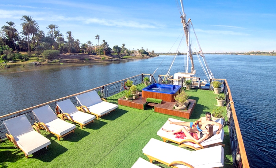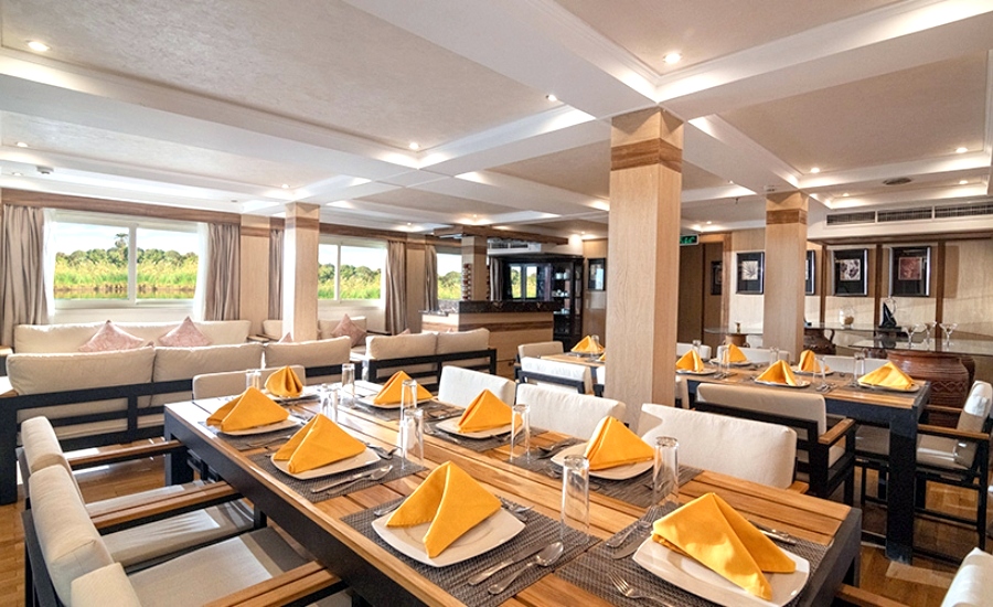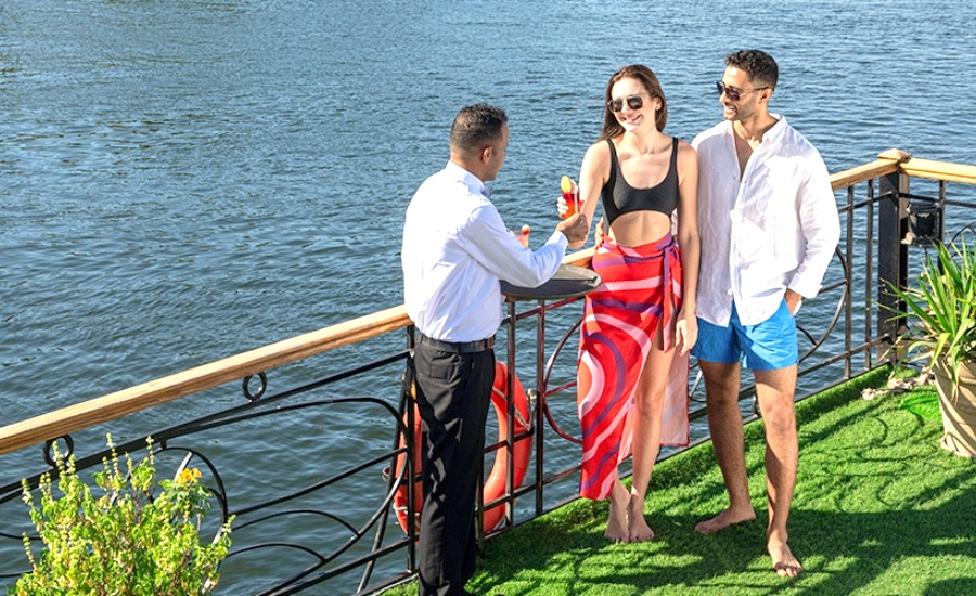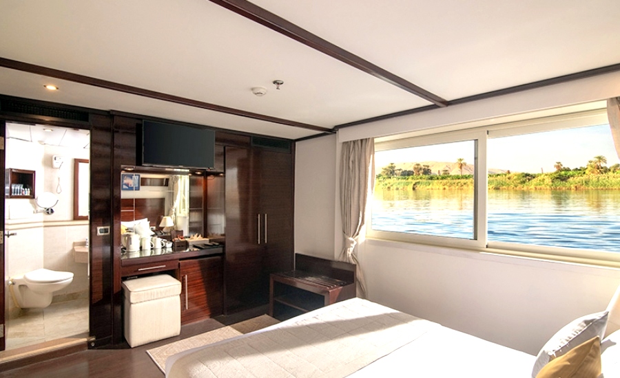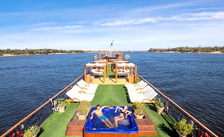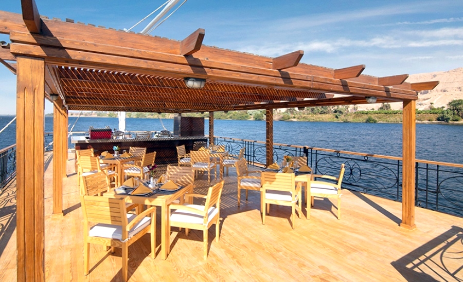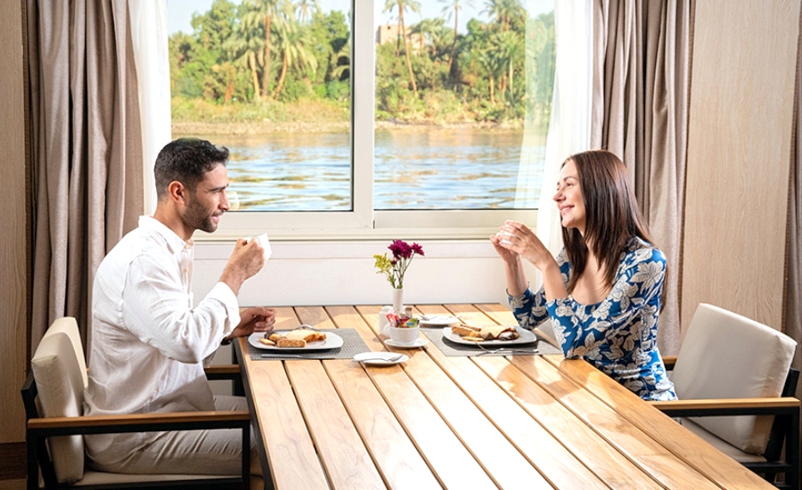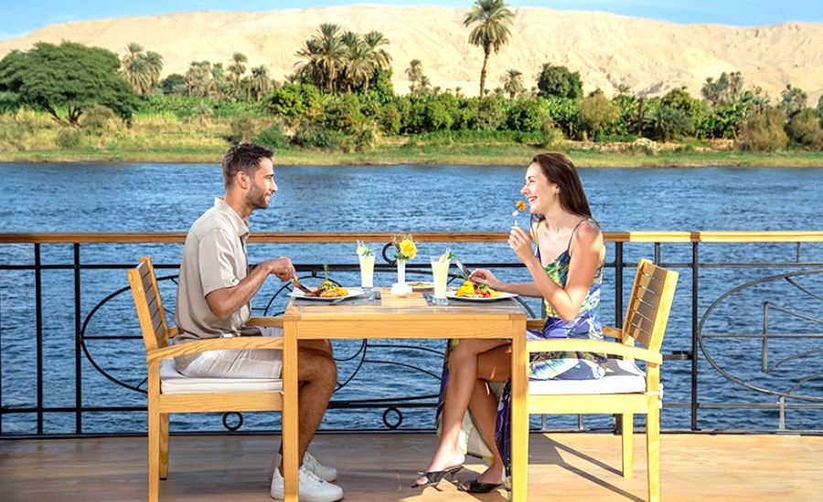 Spend tranquil mornings on the shaded sundeck, then enjoy guided excursions to archaeological gems like Edfu and Kom Ombo. The evenings come alive in the Oasis Lounge and Atrium Bar, where cultural performances and light dance set a memorable tone. The Palm Court Restaurant serves up gourmet meals, while guests also enjoy access to a cozy library, cinema lounge, and casual terrace café—perfect for capturing stunning Nile views.
