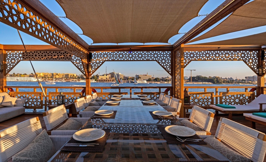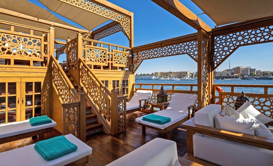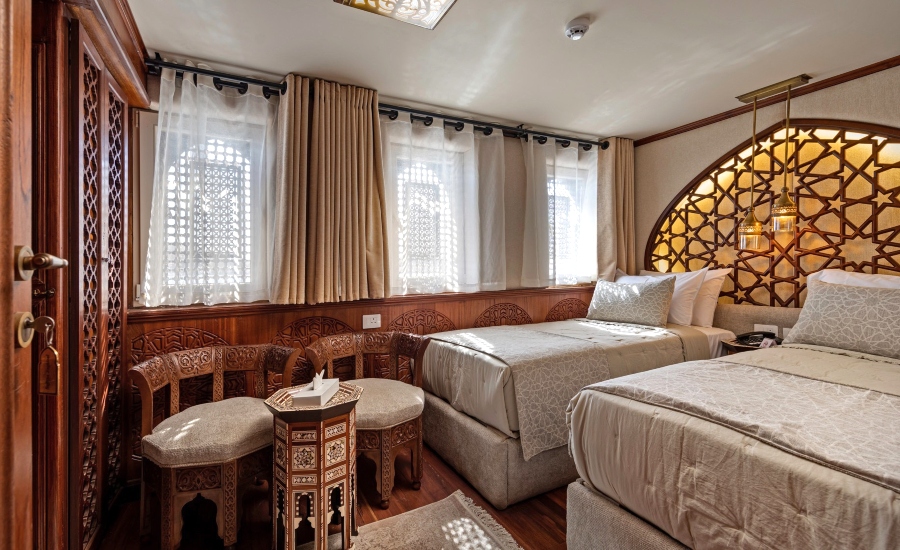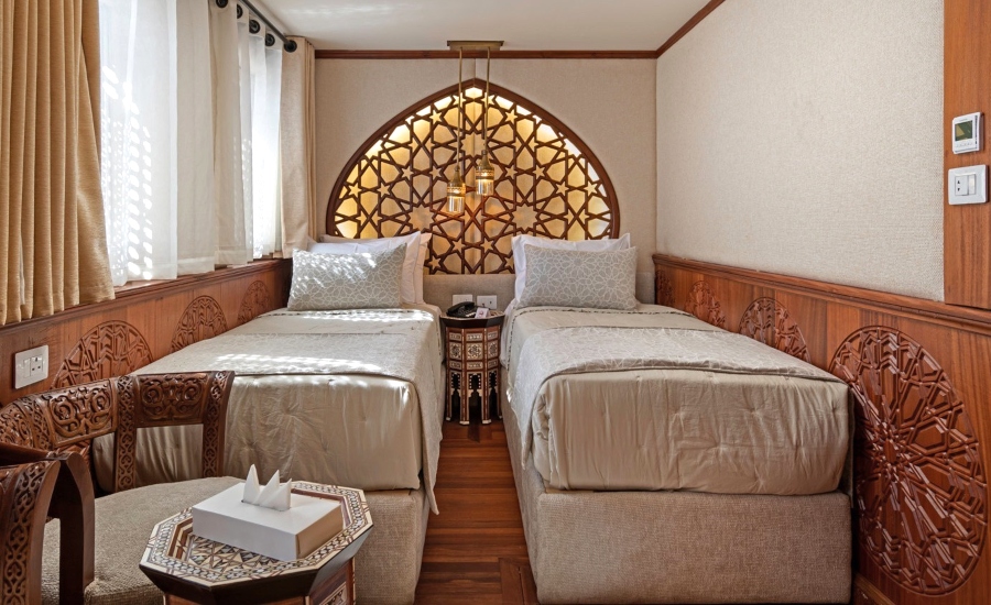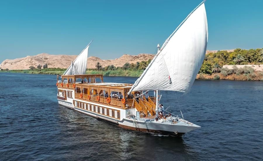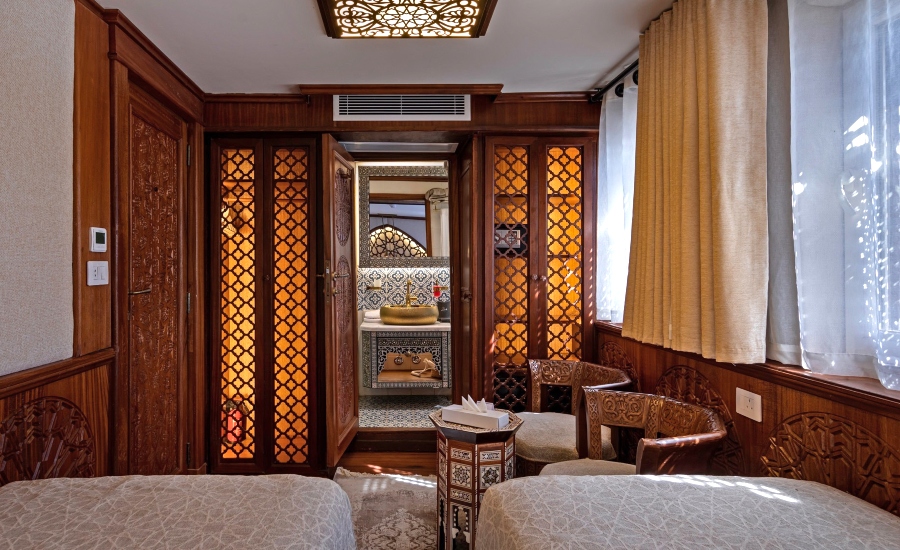 El-Hanem Sailing Dahabiya Cruise features six beautifully designed cabins, each named after a distinguished "Hanem," reflecting a rich history of respect and affection for esteemed women as they enjoyed every detail from the handmade Egyptian cotton sheets to the natural dark wood furniture. Still designed to tickle your senses and enhance your comfort as you explore iconic landmarks such as the Valley of the Kings and Karnak Temple in Luxor, then continue your adventure to Aswan to discover the majestic Philae Temple. All the while, you'll experience personalized service, exquisite dining, and serene sailing, far from the bustling crowds of larger vessels.